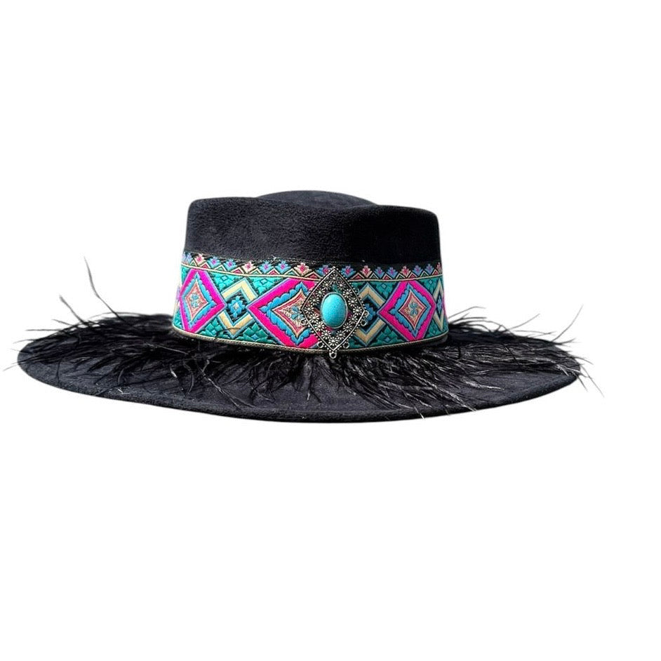 Sombrero de gamuza negro con forma de corazón, plumas y liston. Pieza unica!